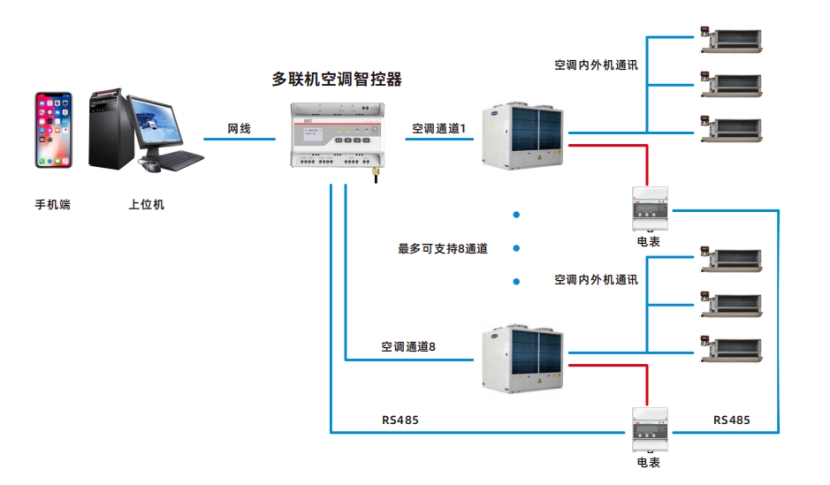 多聯機空調智控系統解決方案主要由多聯機空調智控器、智能電表、艾科智慧能源管理平臺對應子系統組成。在多聯機空調系統上加裝多聯機空調智控器負責空調運行參數和空調用電量的采集,并將數據上傳至艾科智慧能源管理平臺,實現多聯機空調的遠程監控和計費功能。