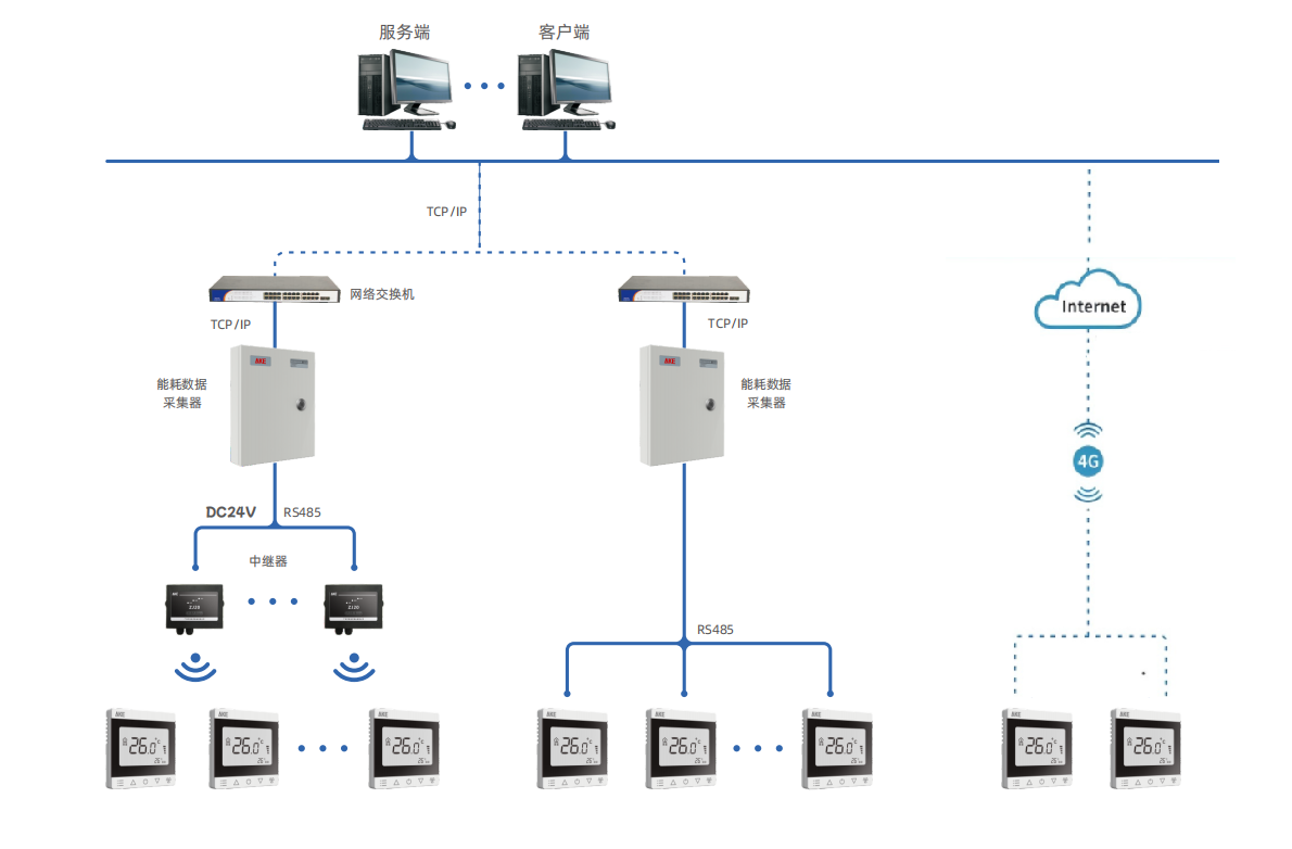 風機盤管聯?溫控系統通過對聯?溫控器實施全?的監測和智能化管控,實現對空調末端的室內溫度、設置溫度、?速、模式等參數的采集、監測和控制,從?實現節能降耗。