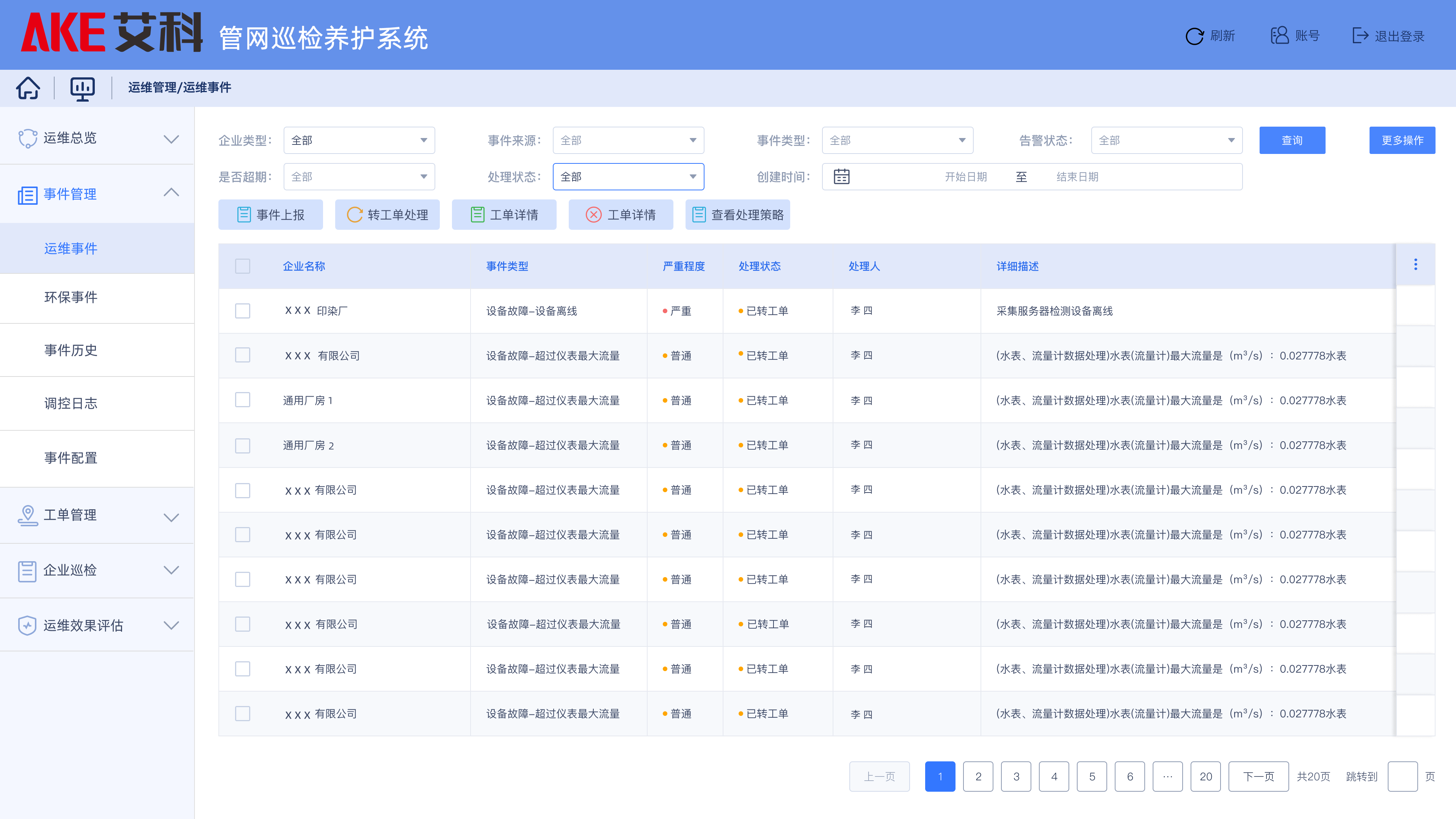 基于管網GIS,以工單管理為核心,對巡檢上報、任務受理、居民報修、熱線上報、開關閥操作等管網維修養護事件進行統一管理。