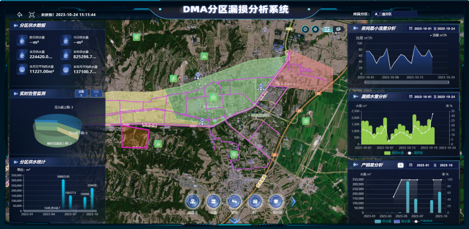 02、DMA分區漏損分析:展示預設的DMA分區基礎數據,結合營收系統的產銷數據,并通過特定的漏損算法分析,直觀展示DMA分區漏損情況,為水司工作人員提供數據分析支撐,優化產銷差率。