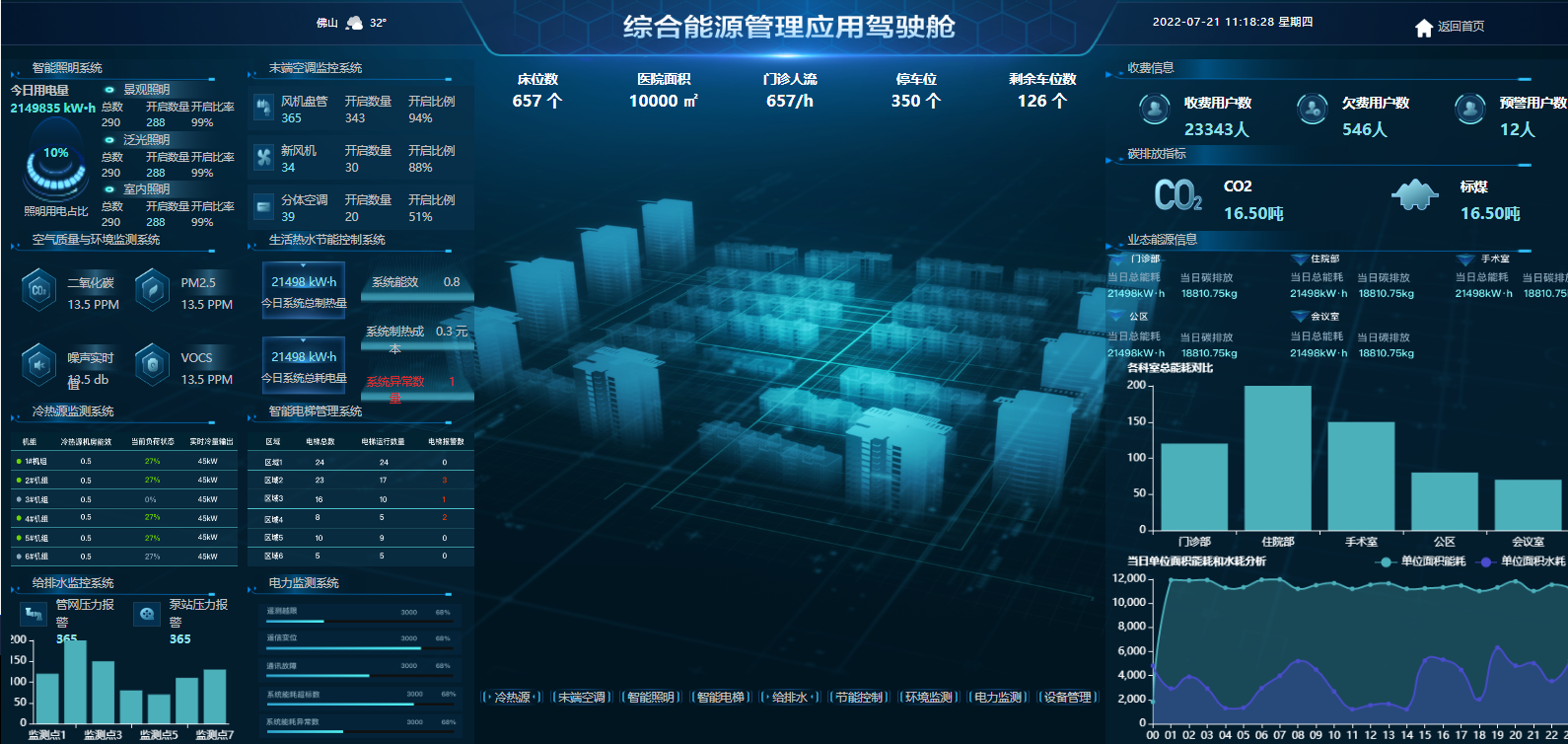 結合醫院醫療設備復雜、用能時間長、對能源供應安全性要求高等實際情況,艾科為醫院量身搭建了「醫院智慧能源監管平臺」,對醫院能耗系統從“水、電、冷、熱”等各方面進行一體化管理,最大程度降低醫院運營能耗。
